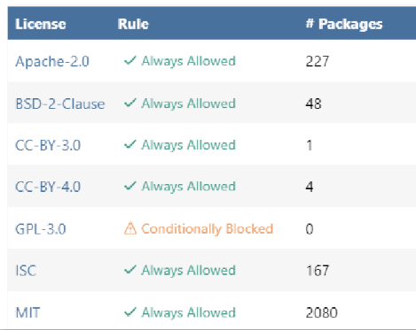 빌드에 사용된 패키지를 관리하는 오픈소스 라이선스에 대한 전체적인 가시성을 확보하고, 원치 않는 라이선스가 사용될 때 차단하거나 경고하도록 규칙을 정의할 수 있습니다.